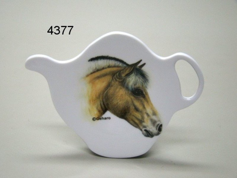 Een sierlijke theetip met een getekend portret van de fjord – het stoere, maar vriendelijke paard dat bekendstaat om zijn blonde manen met donkere aalstreep. De illustratie laat mooi zien wat deze paarden zo bijzonder maakt: krachtig en robuust, maar tegelijk met een zachte uitstraling.
