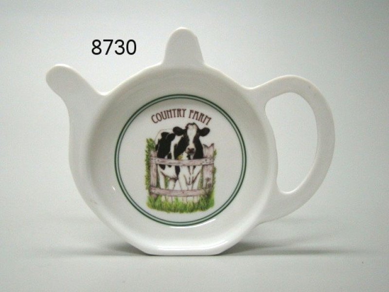 Mooie theetip met een afbeelding van een koe op de boerderij, uitgevoerd in een landelijke, charmante stijl. Perfect om je keuken of theeset een gezellige, landelijke sfeer te geven.